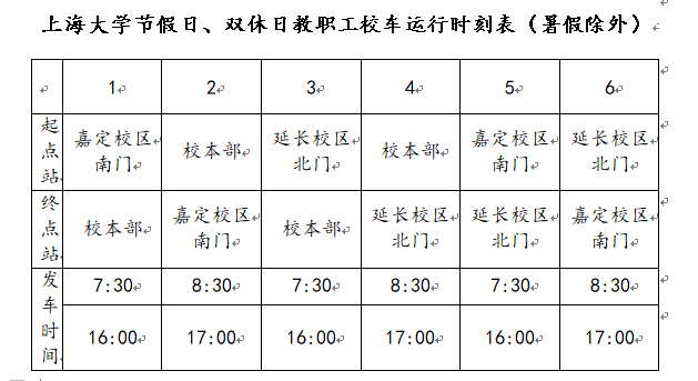 根据上级关于公务车改革的相关要求,为了规范学校校车的运行以及保障多校区办学的需求,学校决定对原有的班车运行模式进行调整,取消校外班车点,自2018年秋季学期开始(2018年8月31日)实施新的校车运行方案。现将最新校车运行时刻表通知如下(以下为暂行时刻表安排,根据开学后实际运行情况,车辆安排会进行微调,敬请关注校园官网最新通知):