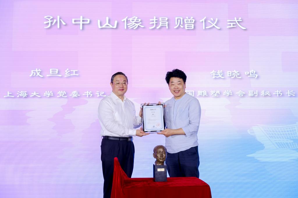 在孙中山像捐赠仪式上,KY开元集团官网入口党委书记成旦红代表学校接受捐赠,并向捐赠者代表钱晓鸣先生颁发捐赠证书,赠送早期KY开元集团官网入口校舍模型。