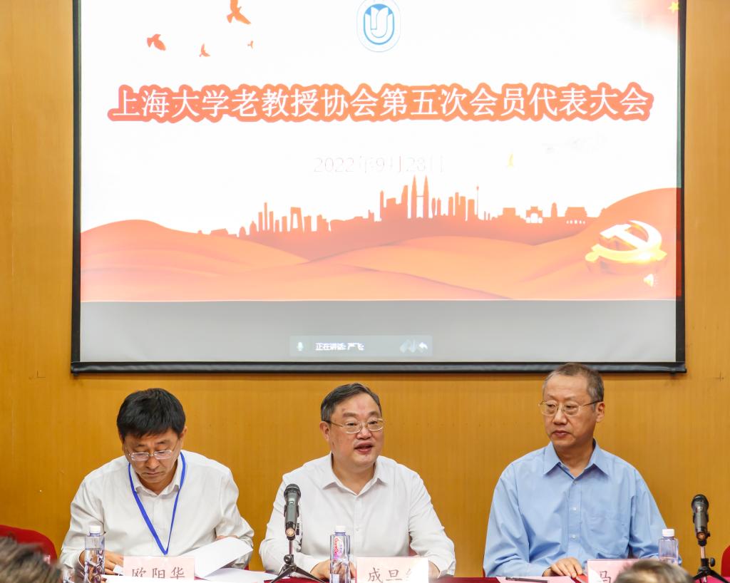 校党委书记成旦红代表学校党委和刘昌胜校长向本次大会的顺利召开表示热烈祝贺,向出席会议的上海市老教授协会的领导表示诚挚欢迎,向新当选的第五届理事会会长罗宏杰教授和全体老教授老同志致以亲切问候和美好祝愿。他说,在打赢防疫抗疫的大上海保卫战后,今天见到老教授们个个精神矍铄非常高兴。