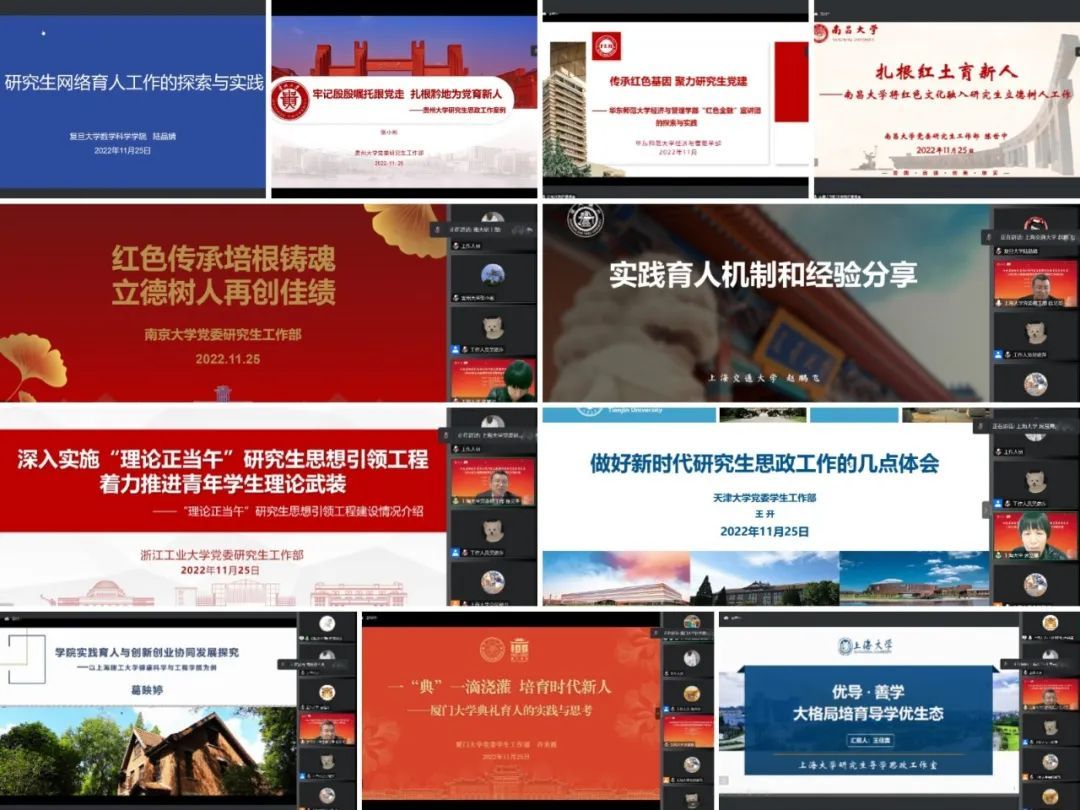 贵州大学党委研究生工作部部长张小彬介绍贵州大学的特色思政教育课程,以及研究生思想政治教育多样化的开展形式。南京大学党委研究生工作部副部长李宁分享如何用好红色基因和课程思政进行三全育人的实践经验。天津大学党委学生工作部副部长王开分享研究生教育传统、研究生思政工作的整体规划和研究生思政工作体系的有效探索和实践。厦门大学党委学生工作部副部长许美霞从典礼育人的角度,分享思想政治教育工作的实践与思考。南昌大学党委研究生工作部副部长陈世中讲述了南昌大学扎根红色土地,将红色文化融入研究生立德树人工作。华东师范大学经济与管理学部党委副书记张艳虹分享“红色金融”宣讲团以研促学,产教融合,结合学科特色的实践项目走进社区与基层的故事。复旦大学数学科学学院党委副书记陆晶婧分享了数科学院特色的网络综合育人特色项目实践。上海交通大学团委副书记赵鹏飞通过分析析学生社会实践工作特点,介绍实践育人工作机制,分享打造知行合一育人体系,优化实践教学的经验方法。浙江工业大学党委研究生工作部思政办主任刘娅婷介绍“理论正当午”研究生思想引领工程品牌项目的发展脉络和做法实践,分享总结推进青年学生理论武装的经验启示。KY开元集团官网入口机电工程与自动化学院研究生辅导员王佳寅交流了如何不断构建导师、辅导员、研究生的导学思政育人体系,和培养德才兼备的“五为”创新人才的启示。上海理工大学健康科学与工程学院辅导员葛映婷分享将思政教育与创新创业融合,结合学科不同特点,分享“三层递进”创新创业训练项目体系的构建经验。