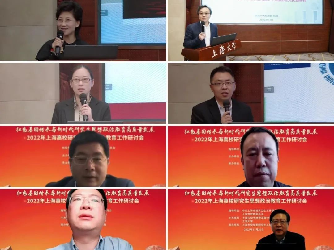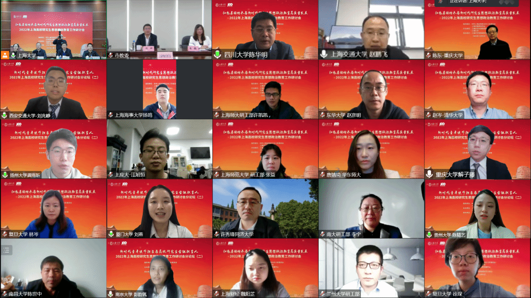 清华大学党委研究生工作部部长赵岑分析当代研究生特点,并介绍清华大学研究生思想政治教育、导学思政工作体系、朋辈思政育人队伍和网络思政体系建设。中国共产党第一次全国代表大会纪念馆副馆长阮竣介绍一大会址纪念馆与高校思政的馆校协作项目和开展专题性“大思政课”取得的成效。重庆大学党委研究生工作部部长陈东介绍了以红岩精神为底色的研究生工作体系,分享将红岩精神与研究生思政工作相结合的经验做法。延安大学党委学生工作部部长张翔分享了打造延安精神特色课程体系、推动研究生培养工作高质量发展的经验。复旦大学党委研究生工作部部长陈洁分享了复旦大学打造青年理论宣讲品牌的经验和红色寻访实践模式的创新形式,以及对基于红色基因的“美育+”学习载体的进一步开拓。华东理工大学党委研究生工作部部长孙洪锋结合二十大报告阐释了对研究生思政教育内涵的思考与探索。上海戏剧学院党委学生工作部部长李冬梅介绍上戏“戏剧+思政”教育工作的内涵架构、规律路径和具体实践。四川大学党委研究生工作部部长陈华明介绍研究生党员学长制的制度建设、实施方法和发展历程,交流发挥研究生党员学长朋辈引领作用的探索与实践。