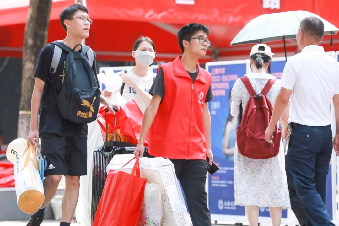 “上大蓝宝团”提前两天到校,他们是“幸运儿”,更是“奉献者”。身着“蓝宝”T恤,他们穿梭忙碌在新生报到的一线。