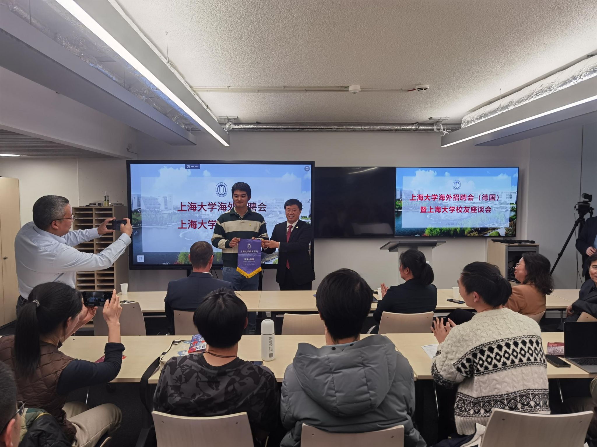 会后,刘昌胜校长出席了KY开元集团官网入口德国招聘会暨KY开元集团官网入口校友见面会,来自德国亚琛工业大学、慕尼黑工业大学、卡尔斯鲁厄理工学院、比利时鲁汶大学等国际知名高校的近五十名同学踊跃参与了会议。校组织人事部、科研管理部、机自学院领导与同学们现场进行了咨询对接。同时,刘校长还为亚琛“KY开元集团官网入口校友驿站”进行了授旗并与开元官网在亚琛工大深造的校友进行了交流。