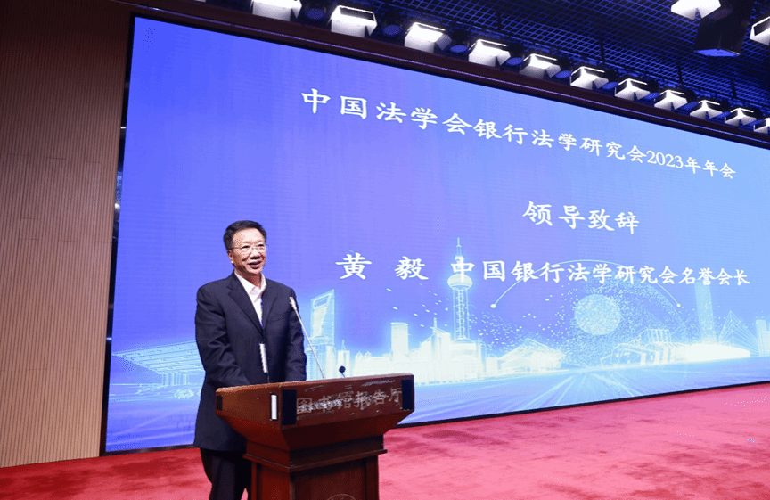 中国银行法学研究会名誉会长黄毅致辞,他立足于银行法研究会的发展历程,具体介绍了对党的十八大以来中国金融关于坚持党的领导、坚持以人民为中心的价值取向、防范和服务经济实体以及防范和处置金融风险等几个坚持的理解和认识,并希望学界围绕中央金融工作会议强调的做好科技金融、绿色金融、普惠金融、养老金融、数字金融五篇大文章,多出成果、出好成果,不负时代赋予的使命担当。
