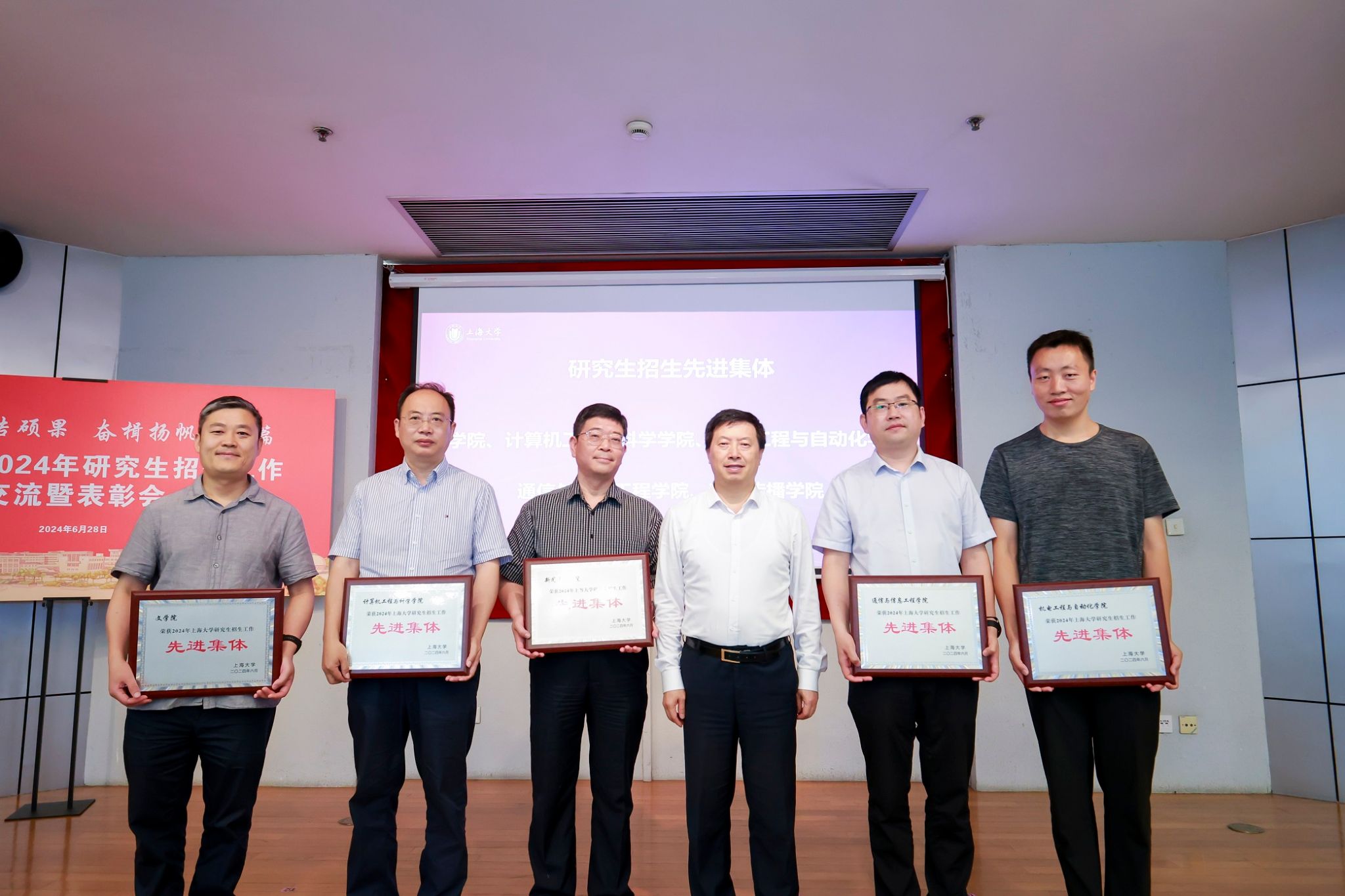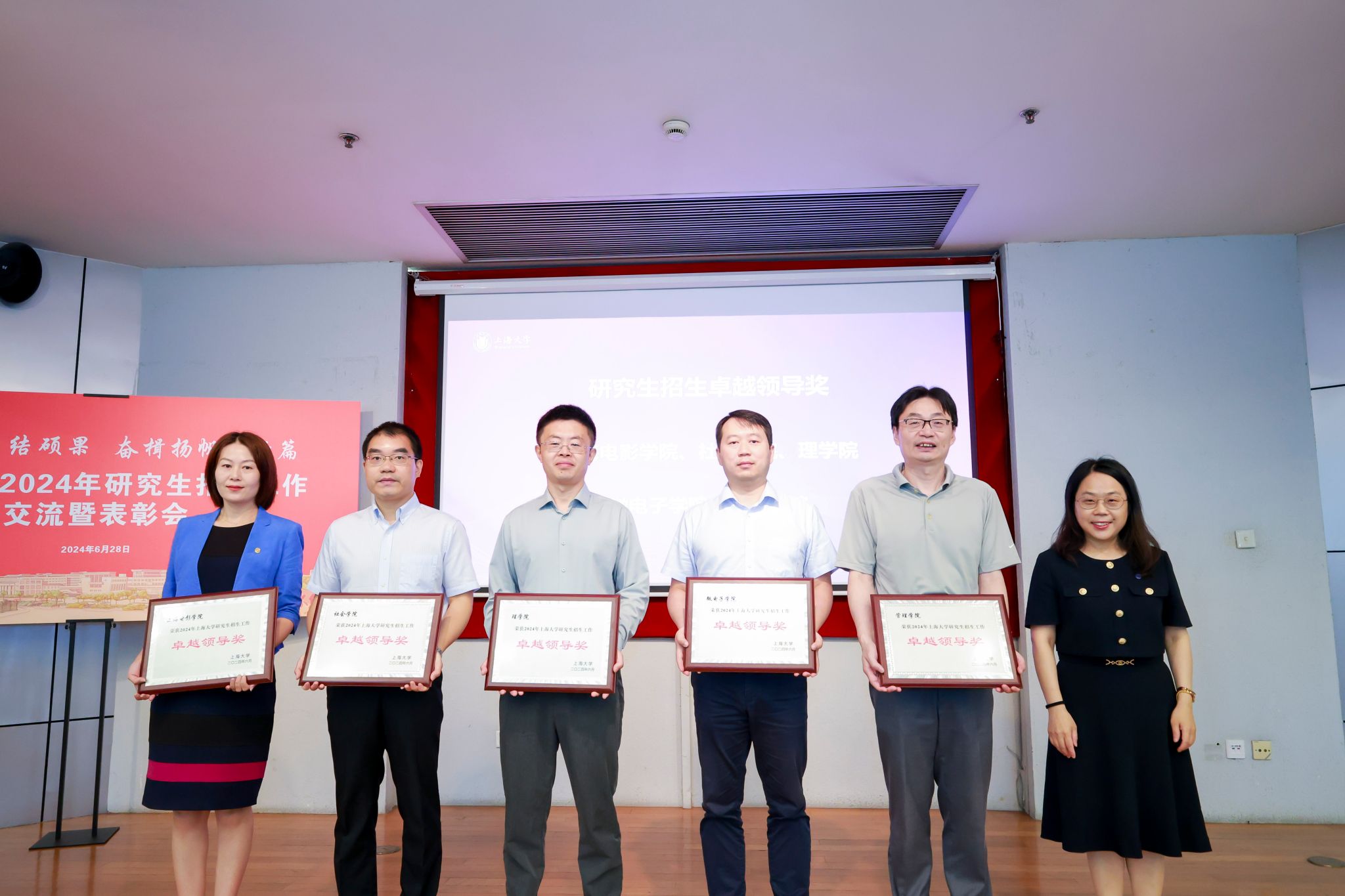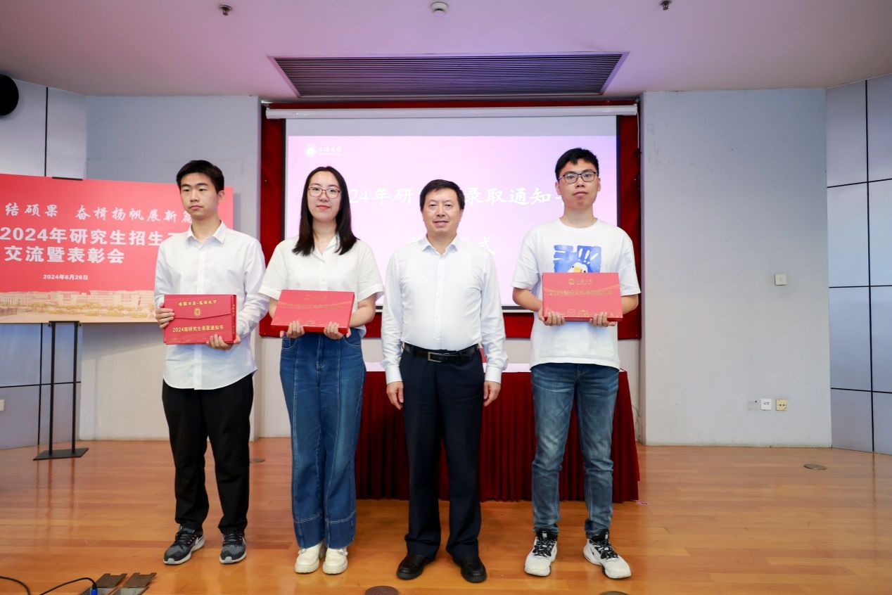 张建华副校长宣读2024年研究生招生工作表彰名单。校研究生招生领导小组成员王沁、许华虎和研究生院副院长姚蓉等共同为21家获奖单位和18位先进个人颁发荣誉证书和奖牌。