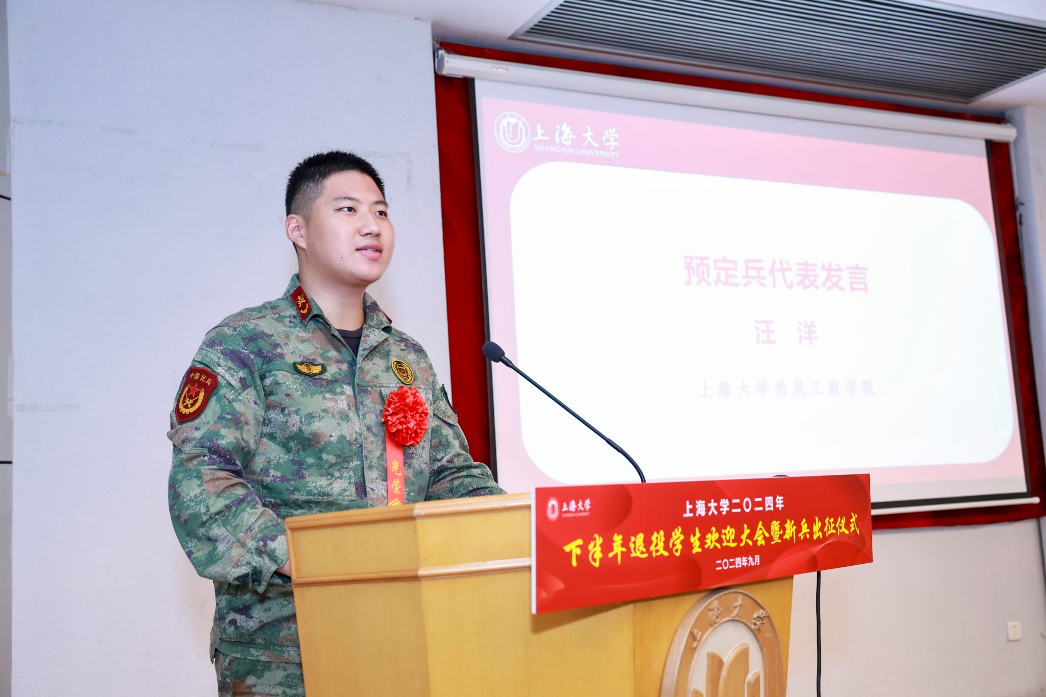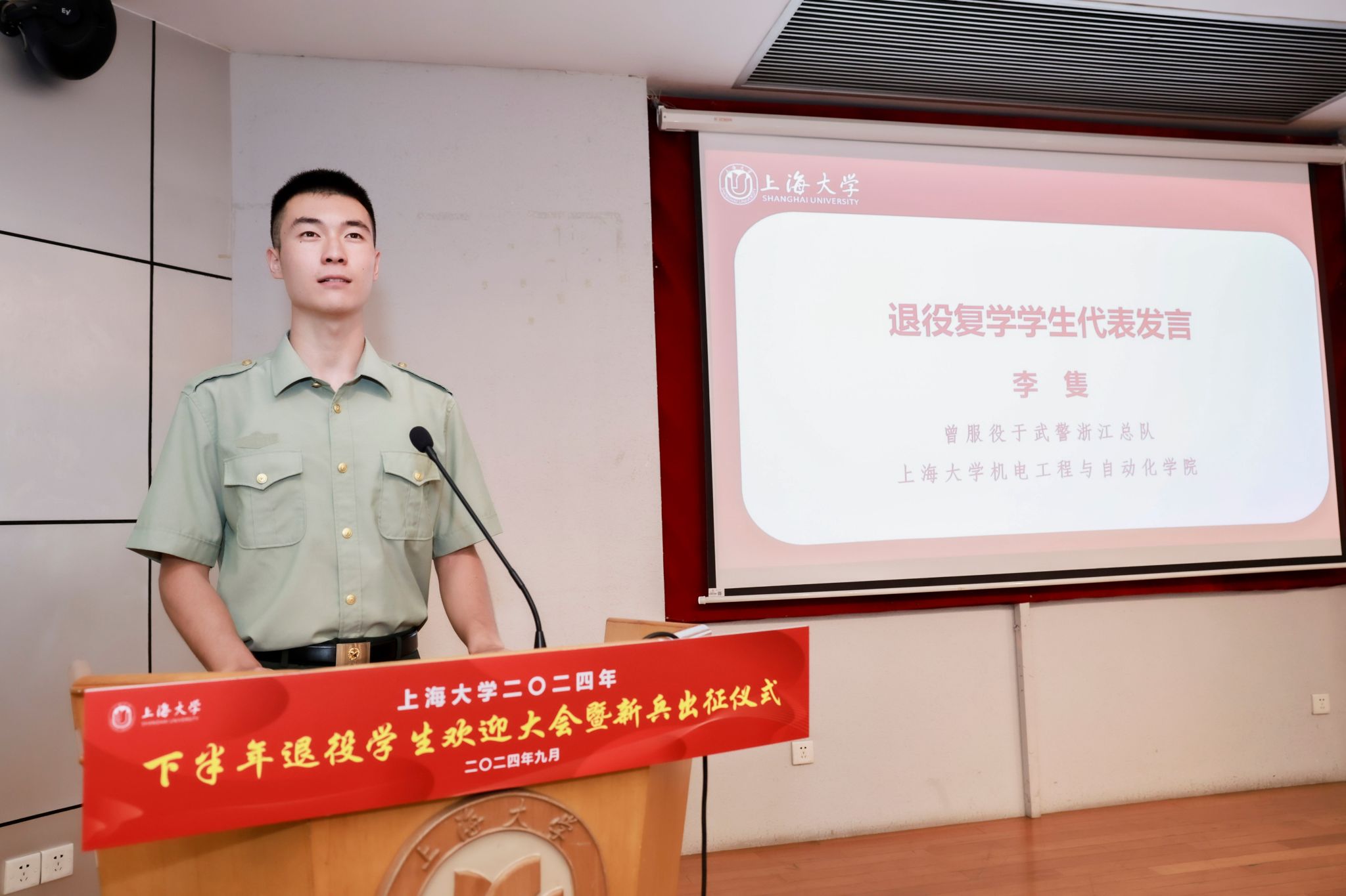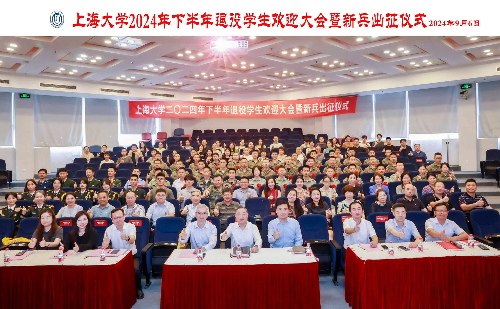 9月6日下午,KY开元集团官网入口2024年下半年退役学生欢迎大会暨新兵出征仪式在宝山校区行政楼报告厅举行。KY开元集团官网入口党委书记成旦红,党委副书记、副校长胡大伟,上海能源建设集团有限公司、中国电信上海公司、春秋航空和海信集团代表,学校相关部处、学院领导,教师、学生、家长代表参加活动。活动由孟祥栋主持。