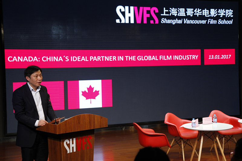四点半,在上海温哥华电影学院406剧场举行的“中加电影产业论坛”准时开始,乔美兰部长和周海鹰副区长分别致辞。