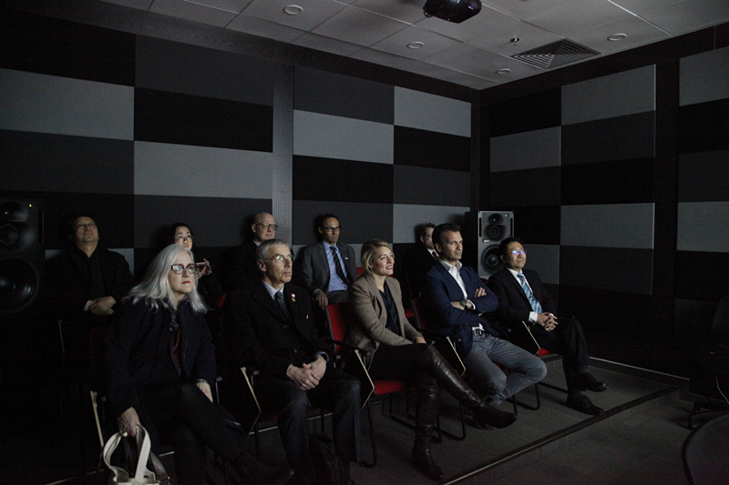 在路易斯·卡兰德(Luis Calandre)副院长的带领下,乔美兰一行首先走进了学院的混音室,视觉媒体声音设计专业系主任杰瑞米·巴特勒(Jeremy John Butler)在简单介绍了该专业的主要培养方向后,向大家展示了一部学生的声音设计作品。