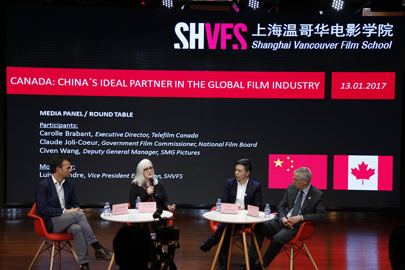随后,SMG尚世影业副总裁王庆丰等上海影视产业届代表以及上海温哥华电影学院师生与加拿大影视管理局执行主席Carolle Brabant、加拿大国家电影局官员Claude Joli-Coeur先生就“中加合拍片:机遇与挑战;中国电影产业对全球的影响;怎样在海外更好地利用加拿大的电影技术;科技对电影产生的影响”等议题进行了热烈的讨论和问答。