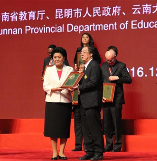 12月10日至11日,第十一届孔子学院大会在昆明举行。来自140个国家的大学校长和孔子学院(课堂)代表、各国驻华使节和语言文化推广机构代表等约2200人齐聚春城展望孔院未来发展蓝图。本次大会共评出25家“全球先进孔子学院”,宋卡王子大学普吉孔子学院从全球511所孔子学院中脱颖而出,荣获2016年“全球先进孔子学院”称号。刘延东副总理为获奖单位和个人颁奖,宋卡王子大学副校长普瓦东先生,普吉孔院泰方院长颂塔雅和中方院长阚怀未赴大会领奖。