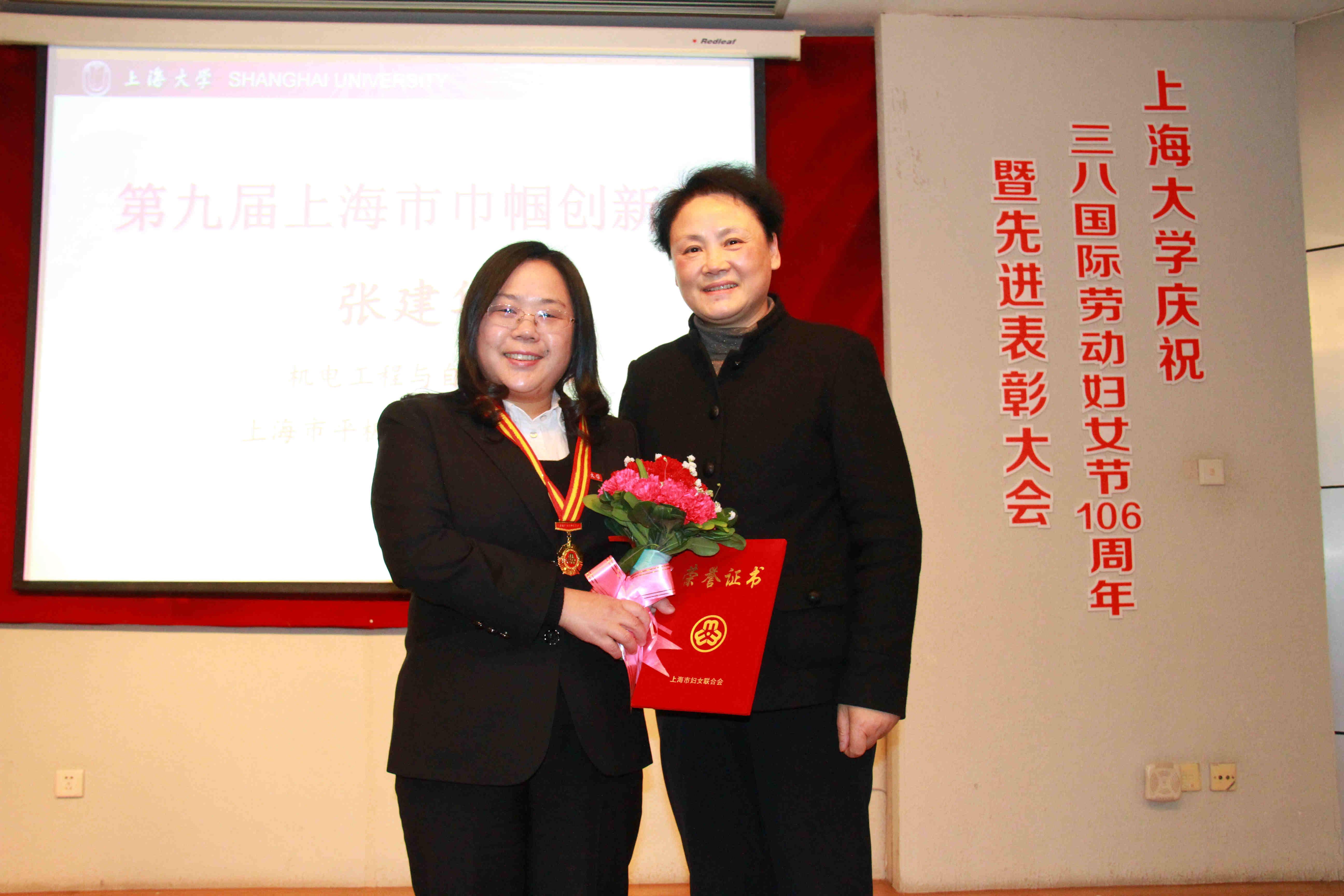 校工会常务副主席、妇委会常务副主任顾红宣读了表彰决定和获奖名单,大会颁发了上海市巾帼创新奖、上海市巾帼建功标兵、“比翼双飞模范佳侣”等奖项。