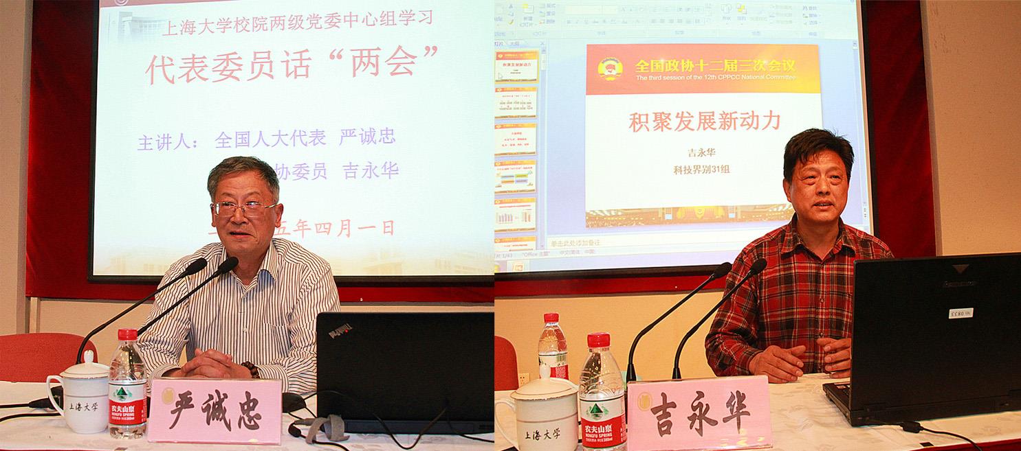 4月1日,开元官网2015年第二次校院两级党委中心组学习会在校本部行政楼报告厅进行。会议邀请了第十二届全国人大代表、东华大学经济发展与合作研究所所长严诚忠教授和第十二届全国政协委员、民盟中央委员、开元官网生命学院吉永华教授分别作关于传达与解读全国“两会”精神的报告。校党委副书记、副校长李友梅,校党委副书记、纪委书记夏小和,校党委副书记、副校长徐旭,校党委常委、副校长丛玉豪等校领导及校院两级中心组成员、副处级以上干部200余人聆听了报告,会议由夏小和副书记主持。