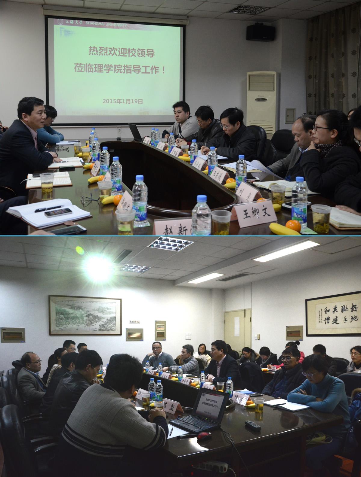 翁培奋代表理学院对丛校长一行选择理学院作为调研工作第一家单位表示衷心感谢,并就理学院的学科建设布局、师资队伍、科学研究和人才培养等做了全面系统的介绍。陈玺以《通识教育背景下,深化教育教学改革》为题,从理学院教学工作的基本情况、大类招生背景下教育教学改革探索与实践,以及今后工作的思考三个方面详细汇报了理学院的本科教学和人才培养工作。通过详实数据对照分析,汇报反映了骨干教师兢兢业业,教书育人,承担和比较出色完成了大量的繁重的基础课授课任务。以2014年为例,理学院开设一年级公共基础课19门,占一年级理工大类全部课程(除通识课、研讨课)的45.3%。在深化改革、合力育人方面,以大类招生为契机,推动本科教育教学改革,建设了5门学院公共平台课,用于对接一年级大类通识课程教育和“厚基础、宽口径”的育人理念,努力为学校高峰高原学科培养复合型的创新人才。在骨干教师本科教学激励计划的实施过程中,理学院教授为本科生授课率在原基础上提升10.43%。组织参与学科竞赛21类,获得了全国百个大学生“小平科技创新团队”,第十届国际工程力学竞赛理论比赛个人一等奖和美国数模竞赛一等奖等多个奖项,努力搭建竞赛育人平台。与社区学院合作“课内外联动教师进社区”达到130人次/学期,开展社区联动项目13项。在听取汇报中,丛校长边听边记,不时地询问微积分、大学物理等相关重要基础课程细节,对理学院本科教学特别是公共基础课对整个学校人才培养所做出的贡献给予了充分肯定。