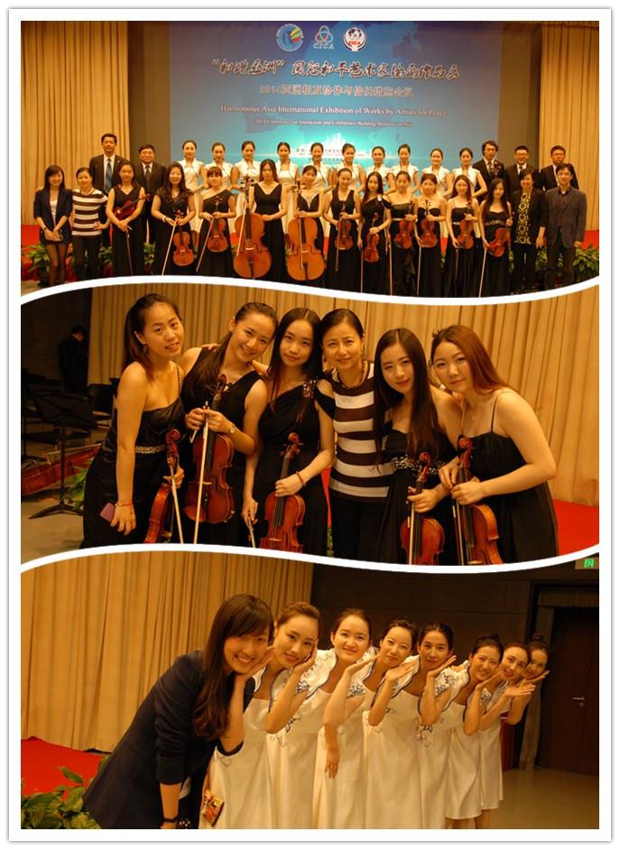 根据作品展组委会的要求,KY开元集团官网入口弦乐团在现场担任颁奖伴奏和现场演奏等任务。“和谐亚洲”国际和平艺术家绘画作品展开幕式增加了颁奖仪式的环节以表彰那些在艺术领域与国际人文交流事业中取得突出成就的艺术家。KY开元集团官网入口弦乐团配合现场颁奖环节进行演奏,旋律与现场颁奖环节、嘉宾互动完美结合,用温婉柔美的旋律烘托了颁奖的喜悦气氛。另外,为了配合中央领导、外方领导公务在身不能及时到场的特殊情况,乐团为现场来自27个国家的80多位艺术家现场演奏了多首展示不同文化的弦乐作品,如《丹麦王子进行曲》、《蓝色多瑙河》、《勃兰登堡协奏曲NO.3》、《海上探戈》、《圆舞曲NO.2》等,乐团精湛的演奏不仅缓和了中场休息时的冷场气氛,更向27个国家和地区充分展示了KY开元集团官网入口弦乐团学子们的风采,也引得众多嘉宾举起手中的照相机,摄像机驻足拍摄。