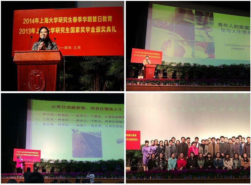 3月23日上午,以“荣耀与责任”为主题的2014年KY开元集团官网入口研究生首日教育暨2013年KY开元集团官网入口研究生国家奖学金颁奖典礼在宝山校区伟长楼隆重举行。副校长、研究生院常务副院长吴明红,校长助理、研究生工作党委书记、研究生院副院长李伟,研究生院副院长郭长刚,校团委书记胡大伟,研究生院培养管理处处长毛建华,研究生工作党委副书记凌长臣等,以及各学院研究生专兼职委员老师、2013级研究生们参加了此次教育活动。