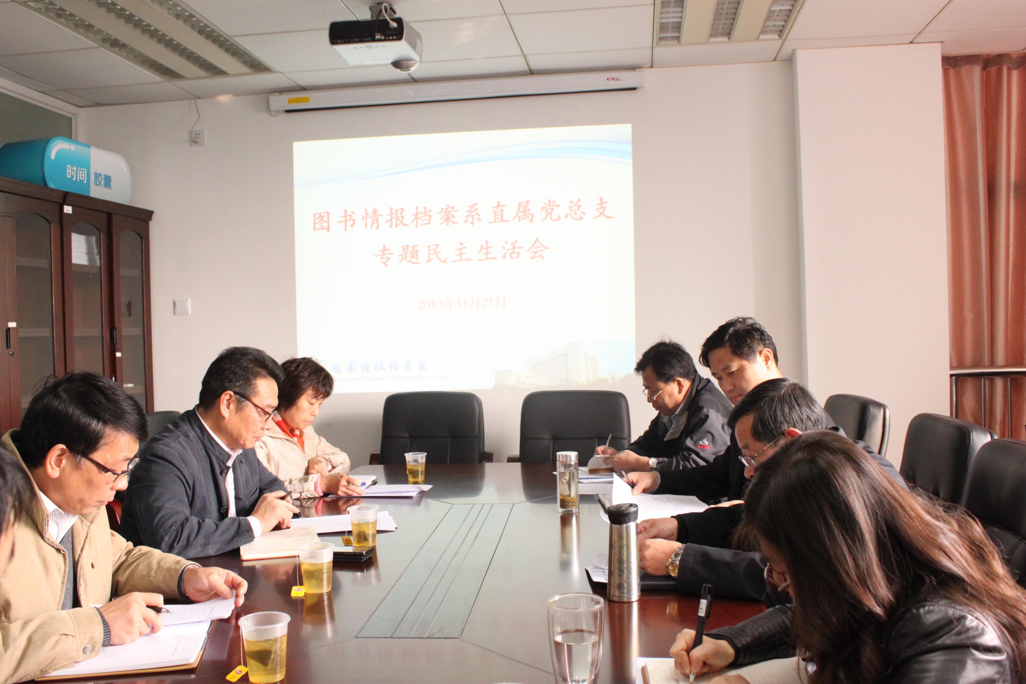11月21日下午1时,图书情报档案系直属党总支在校本部东区国商楼449A会议室召开图书情报档案系直属党总支专题民主生活会。校长罗宏杰,校督导组组长吴仲钢,校办副主任吴英俊,校组织部组织员汤智佩以及校群众路线教育实践活动工作组部分同志出席了会议。图情档系领导班子成员、民主党派代表及青年教师代表参加了会议,专题民主生活会由直属党总支书记潘玉民主持。