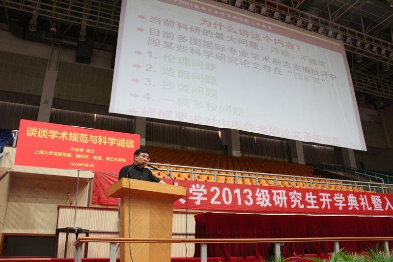 讲座一开始,叶校长首先以当前科学研究中所存在的最大问题:浮躁,不踏实作为讲座的开篇,并进而以“很多国际专业学术杂志要求对中国作者的论文要多加关注”一事,引出中国某些科学研究论文存在的“四宗罪”,即:伦理问题、造假问题、抄袭问题、一稿多投问题。由此引出本次讲座的目的,即希望刚刚涉足科学研究领域的研究生新生,在科学研究中掌握科研工作规范,坚守学术诚信,完善学术人格。