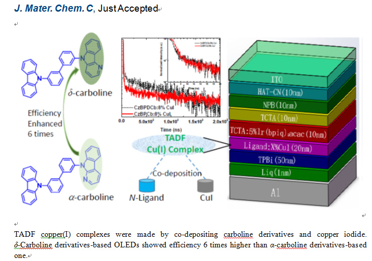 通过含氮材料与亚铜材料共蒸,获得了具有TADF发光的铜配合物,以它们为发光层,实现了外量子效率大于17%的OLED器件,这可以和传统的铱金属配合物相媲美。此研究结果通过常规的含氮有机材料与铜源共蒸获得TADF材料,为开发廉价的铜金属配合物应用于OLED提供新方法。(J. Mater. Chem. )