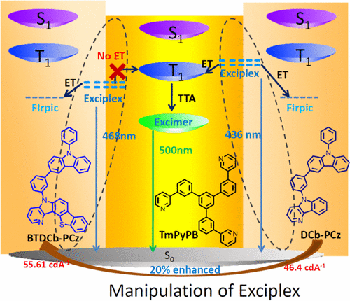 2. 通过化学结构调控分子的HOMO和LUMO 能级实现对激基复合物能级的调控,实现了深蓝/纯蓝的TADF发光。同时以它们为主体材料实现了电流效率大于55 cd/A的蓝色磷光器件。此工作为获得深蓝TADF发光提供了另一个思路。(ACS Appl. Mater. Interfaces)