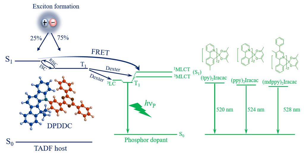 1. 以三嗪骨架为基础获得的TADF材料,制备了效率高达93 lm/W稳定的绿光OLED器件,提出了TADF材料作为主体材料使用时在器件中能量的传递模型,为TADF材料的应用奠定了理论基础。(Chem. Sci.)