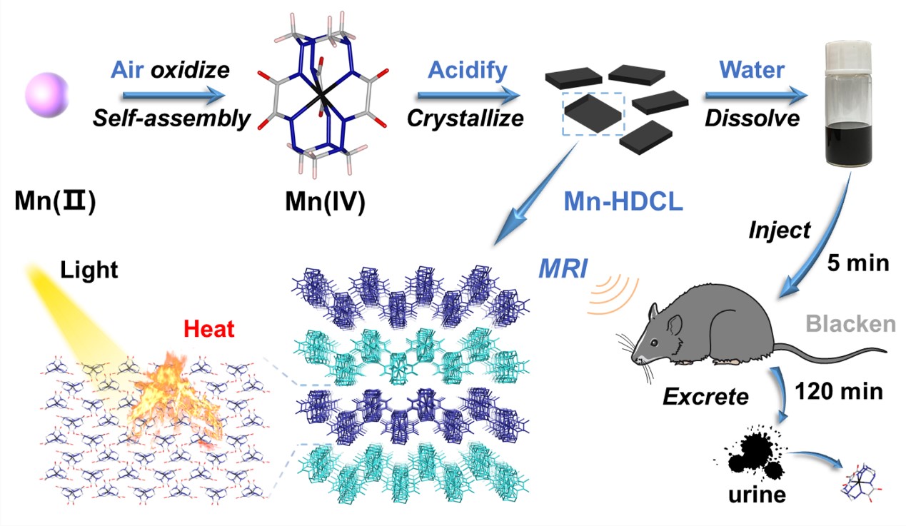 超常价态金属离子拥有丰富的轨道跃迁,在可见光和近红外区域往往展现出强的吸收,因而具有光热转换的性质。然而目前已报道的超常价态金属配合物稳定性不足的问题限制了其应用。该项研究工作制备了一种稳定的、水溶性的,单核Mn(IV)配合物Mn-HDCL,并且在光热治疗和核磁共振成像方面具有很好的应用潜质。