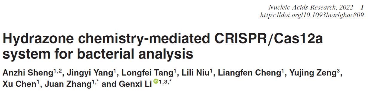 开元官网生命科学学院李根喜教授团队近期在《Nucleic Acids Research》杂志上发表了题为“Hydrazone chemistry-mediated CRISPR/Cas12a system for bacterial analysis”(Nucleic Acids Research, gkac809, https://doi.org/10.1093/nar/gkac809)的原创性研究论文。