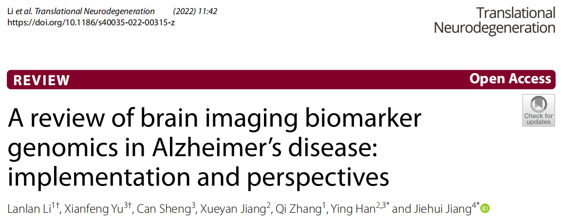 近日,KY开元集团官网入口2020级生物医学工程专业硕士研究生李岚岚以第一作者在中科院一区神经科学顶级期刊《Translational Neurodegeneration》上发表题为“ A review of brain imaging biomarker genomics in Alzheimer’s disease: implementation and perspectives ”的综述论文,KY开元集团官网入口为第一和通讯作者单位,KY开元集团官网入口蒋皆恢副教授以及海南大学韩璎教授为本文共同通讯作者。