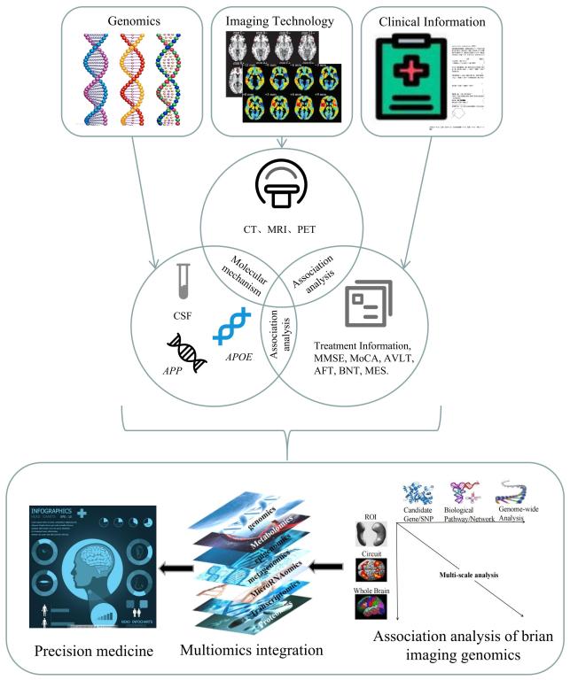 阿尔茨海默病(AD)是一种不可逆的神经退行性疾病,是最常见的痴呆症,其表型变化与遗传变异和影像病理学密切相关。近年来,随着高通量测序技术的发展,全基因组关联研究已经确定了许多与AD疾病和性状相关的风险变异,这些研究提高了学界对遗传复杂性的理解,并为探究AD发病机制的分子途径提供新思路。作为一种新兴技术,结合多模态成像和高通量测序技术的影像生物标志物基因组学(brain imaging biomarker genomics)致力于分析影像表型和基因组学数据之间的关联,并将影像表型用作遗传变异和临床诊断之间的中间表型,以此研究AD的发病机制。该研究方法克服了单一基因组学研究或影像分析存在的缺点,有助于分析基因-疾病的特异性,提升病理生物标志物的生理学解释,并有助于结合多尺度成像和遗传特征进行AD诊断、治疗和预防。目前,影像生物标志物基因组学与临床信息相结合,已经促进了AD领域的许多重要进展(见下图),最终有望在精准医学中发挥作用。