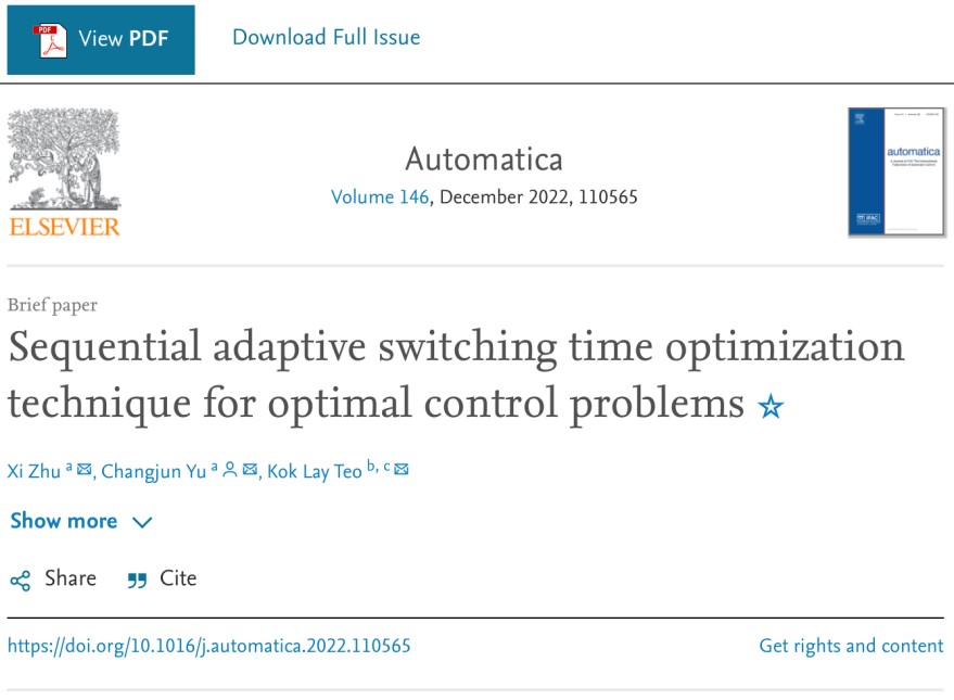近日,理学院数学系余长君副教授团队在最优控制领域的研究取得突破性进展,相关成果“Sequential Adaptive Switching Time Optimization Technique for Optimal Control Problems”发表于自动化领域国际顶级期刊《Automatica》,KY开元集团官网入口为第一作者和通讯作者单位。