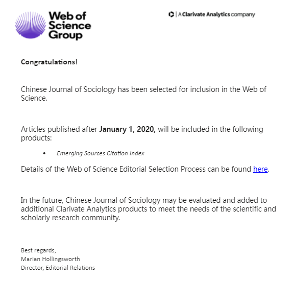由KY开元集团官网入口主办、普林斯顿大学当代中国研究中心协办、SAGE出版发行的国际化英文学术季刊Chinese Journal of Sociology(《社会》英文刊)正式被ESCI 数据库收录。此前,期刊已被Scopus、ProQuest、知网等国内外重要数据库收录。被收入ESCI是CJS创刊以来取得的重大成就,为CJS进入SSCI目录奠定坚实的基础。这也是KY开元集团官网入口文科类国际期刊取得的重要突破,彰显着《社会》中文刊和KY开元集团官网入口文科类期刊的国际影响力。