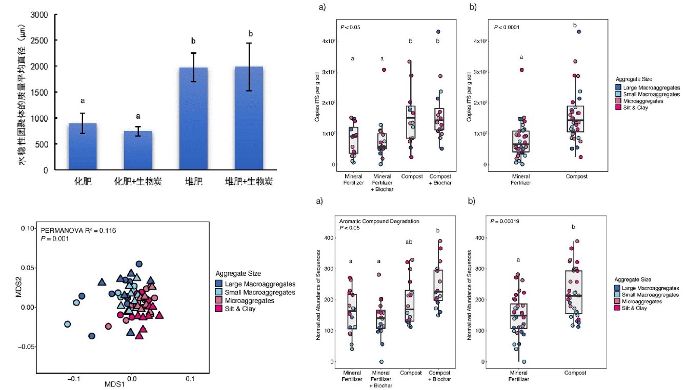 本文工作通过田间尺度的六年长期定位实验,研究土壤团聚体—土壤碳储存—微生物群落的相互作用,发现长期、持续、多样化碳输入能有效促进土壤水稳性团聚体形成,增强微生物群落代谢复杂碳源的能力,丰富土壤微生物可利用碳库,进一步促进团聚体的形成这一微生物驱动的正反馈机制,并发现芳香度高的生物炭对长期的土壤团聚体和碳固存动态的影响有限。本文为在气候变化背景下的农业生产中,运用适当的土壤添加物更高效地维持和提升土壤碳库积累提供科学依据。