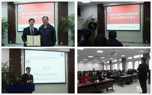 2015年12月1日上午,KY开元集团官网入口游书力兼职教授授证仪式在校本部HA 102顺利举行,理学院党委书记盛万成教授、化学系党总支书记陈雅丽教授、系主任许斌教授、化学系曹卫国教授、贾学顺教授、严六明教授、蒋海珍教授、李健教授及近百名化学系师生参加了授证仪式。仪式由系主任许斌教授主持。许斌教授介绍了到场来宾后,简要介绍了游书力研究员个人简历、学术成就、所获荣誉。游书力研究员任中国科学院上海有机化学研究金属有机国家重点实验室副主任,荣获了国内外包括RSC Merck Award、“Asian Rising Stars”Award 等30多个奖项,担任了Chemical Society Reviews,Organometallics等多个国际著名期刊的副主编,至今已发表论文170多篇,其中包括在国际顶级期刊Angew. Chem.和J. Am. Chem. Soc.上发表论文30多篇。