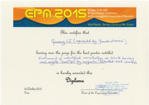2015年10月12 -16日,第八届国际材料电磁加工会议(The 8thInternational Conference on Electromagnetic Processing of Materials-EPM 2015)在法国戛纳举行,这是国际上材料电磁加工领域最重要的国际会议,来自国际上二十个国家的近200名著名学者和研究人员参加了本次会议。会议采用无记名投票方式选出2名最佳墙报奖获奖者(Best Poster Award)。KY开元集团官网入口材料学院钟云波研究员指导的博士研究生李强同学投稿参加了此次大会,并获得了这一殊荣,另一名获奖者来自德国。
