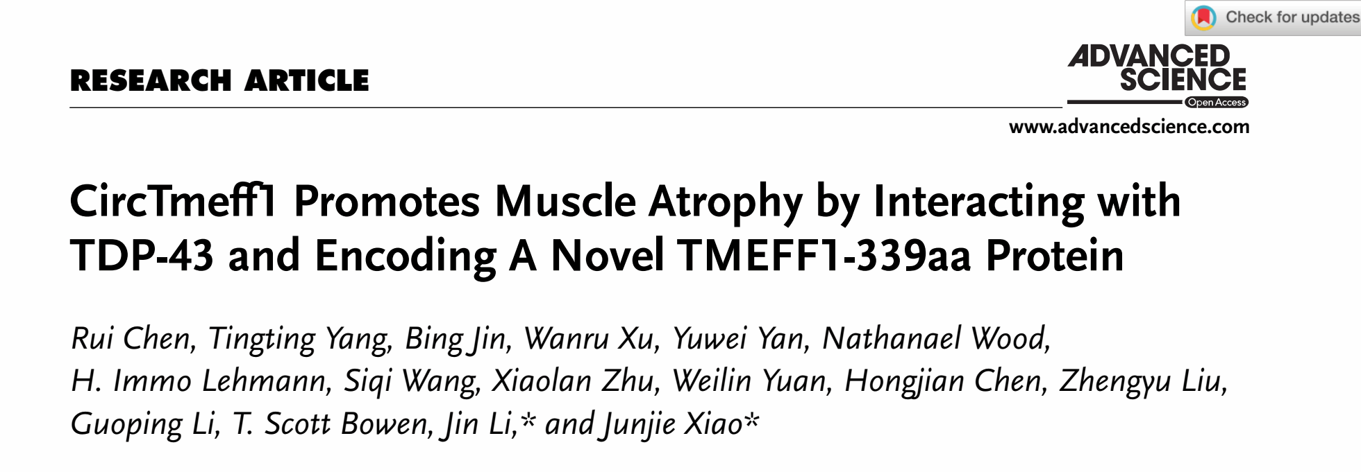 近日,KY开元集团官网入口生命科学学院心血管研究所青年教师李进副教授在肌肉萎缩研究中取得进展,揭示了一个多种不同类型所致肌肉萎缩发生的共同新靶点:环状RNA circTmeff1。相关成果以“CircTmeff1 Promotes Muscle Atrophy by Interacting with TDP-43 and Encoding A Novel TMEFF1-339aa Protein”为题发表在Advanced Science杂志(https://onlinelibrary.wiley.com/doi/10.1002/advs.202206732)。李进副教授和肖俊杰教授为共同通讯作者,博士生陈瑞(已毕业)、杨婷婷(目前为KY开元集团官网入口博士后)和硕士生金冰为共同第一作者,KY开元集团官网入口为第一完成单位。