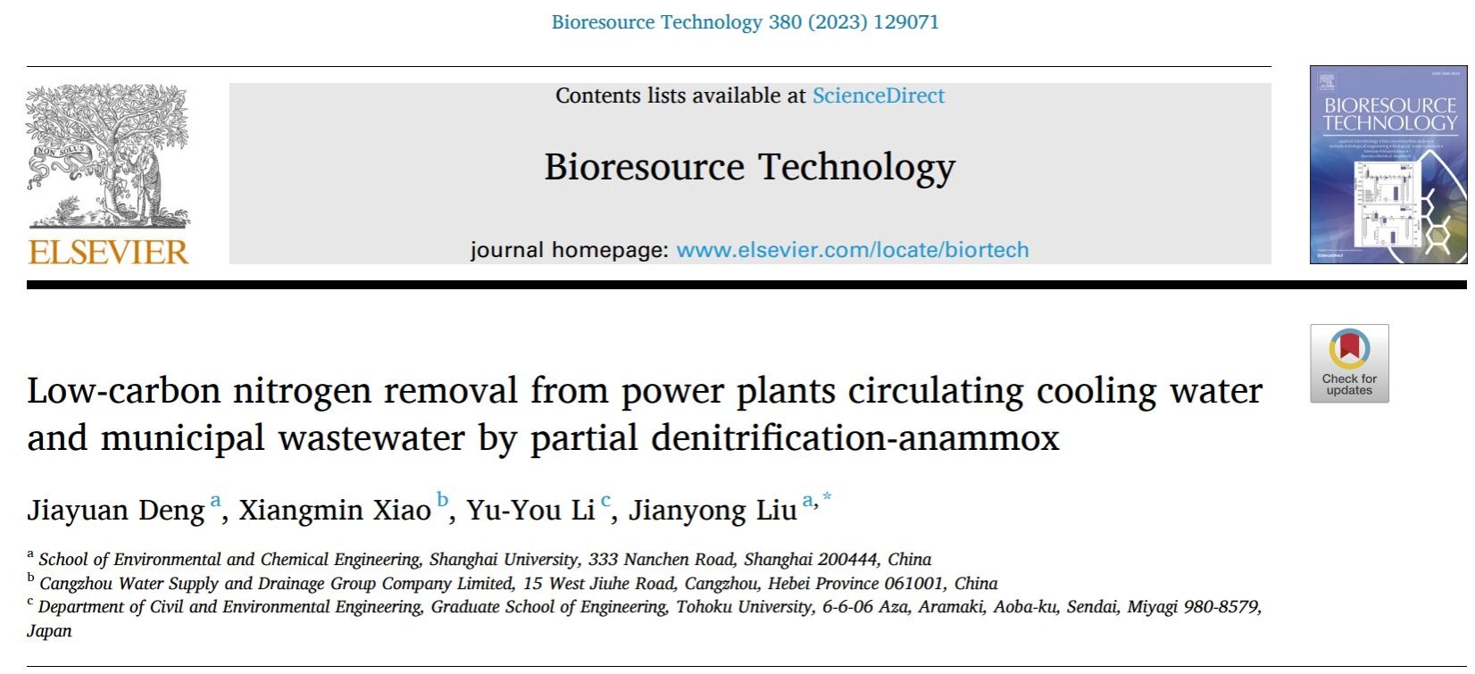 成果一:利用短程反硝化-厌氧氨氧化技术实现电厂循环冷却水浓水与城市污水的低碳处理(发表于Bioresource Technology)