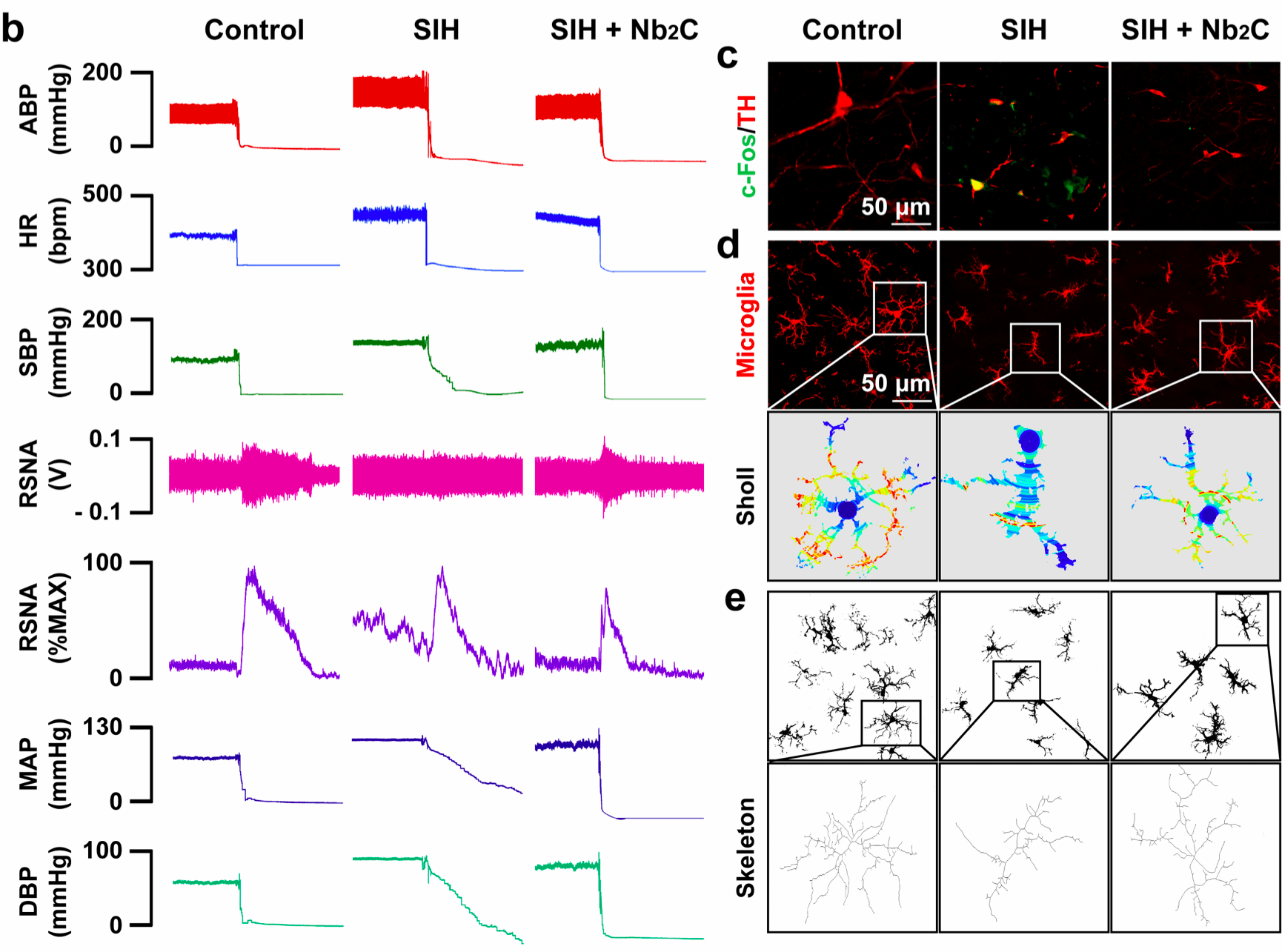 目前,在传统药物治疗中,鲜少有纳米药物作用于中枢核团延髓头端腹外侧区高效清除ROS治疗高血压。为突破高血压治疗和纳米医学之间的壁垒,陈雨教授团队与杜东书教授团队采用湿化学蚀刻和剥离策略获得超薄、高分散、具有超氧化物歧化酶、过氧化氢酶、过氧化物酶和谷胱甘肽过氧化物酶等多种酶活性的碳化铌(Niobium carbide, Nb2C)纳米酶。本研究中采用立体定位微注射技术将Nb2C纳米酶注射至高血压大鼠延髓头端腹外侧区,利用其多酶活性高效清除ROS,研究发现大鼠的血压、心率和肾交感神经放电均显著下降,表现出良好的高血压调控治疗效果。