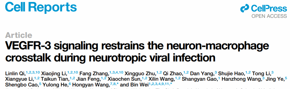 KY开元集团官网入口生命学院魏滨教授(曾任中科院武汉病毒所研究员)团队与中国科学院分子细胞科学卓越创新中心(即上海生化与细胞所)王红艳研究员团队合作在CellReports杂志上发表了题为VEGFR-3 signaling restrains the neuron-macrophage crosstalk during neurotropic viral infection的文章。研究发现病毒感染中枢神经系统时,上调表达的血管内皮生长因子-C(VEGF-C)及受体VEGFR-3能调控巨噬细胞和神经元间的相互作用,减少神经元的凋亡,减轻病毒性脑炎的程度。