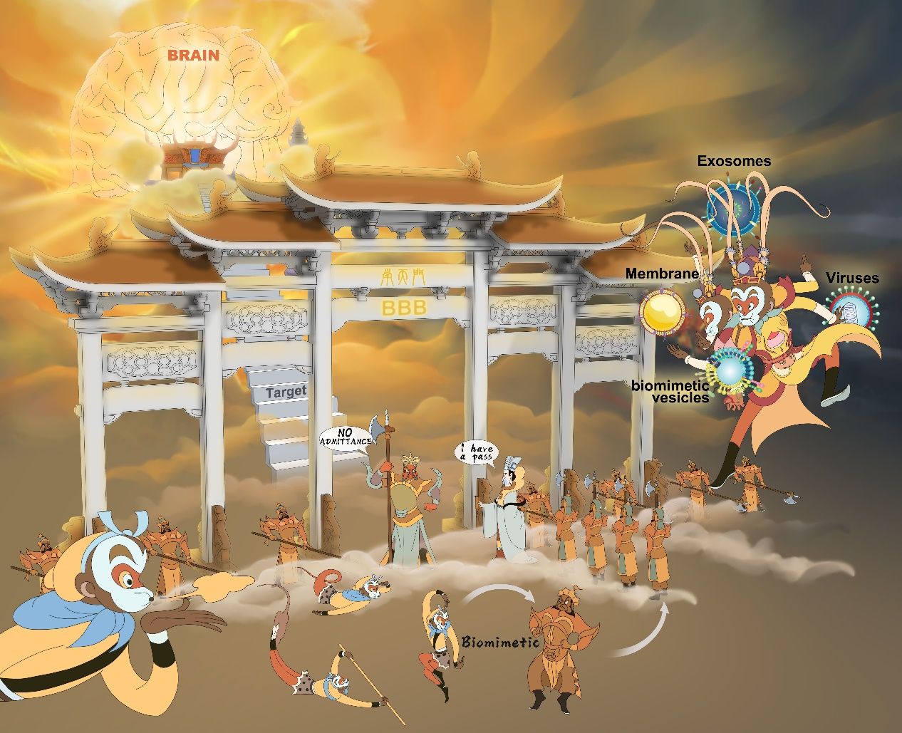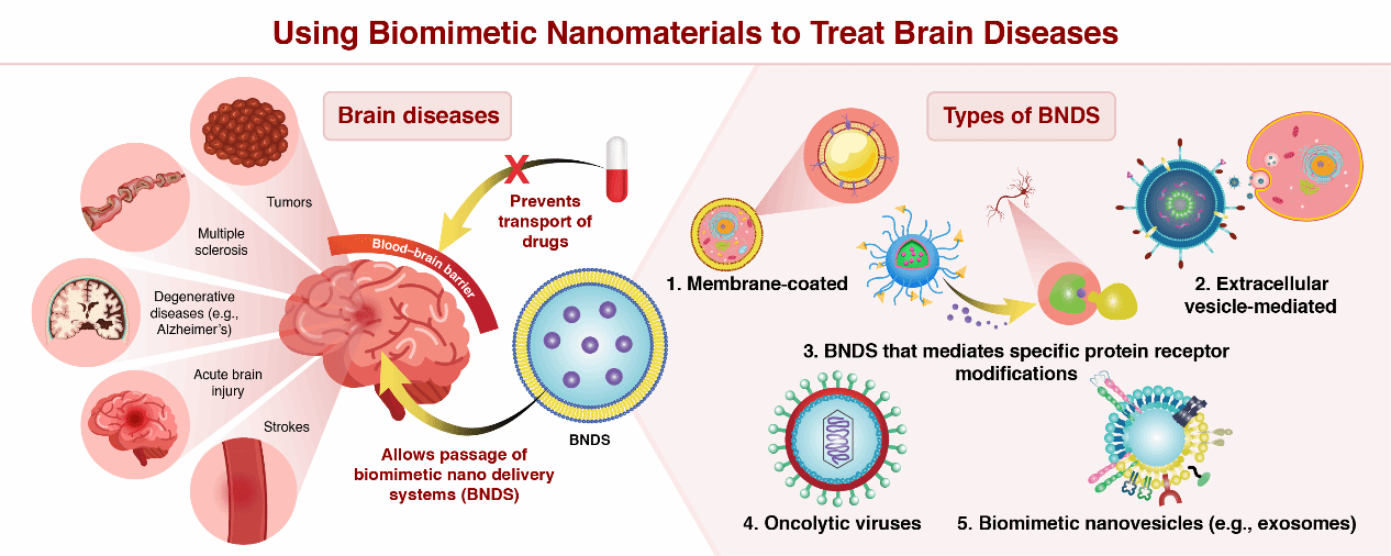 现有的仿生疗法可分为以下几类:(1)天然来源的内源性物质,传统上是从生物体或微生物中提取和纯化的内源性物质,例如包裹细胞、病毒、细菌和细胞外囊泡;(2)合成内源性物质,主要通过一定的技术手段,体外合成可模拟内源性物质的化合物,如磷脂、胆固醇等;(3)模拟病理环境的药物递送系统,通过模拟特定疾病的特定病理条件实现药物的靶向释放。上述先进的仿生纳米递送系统在治疗脑部疾病方面显示出许多优势和临床前应用。与传统的纳米疗法相比,仿生纳米递送系统具有生物相容性和可降解性,可确保其顺利通过血脑屏障到达病灶。此外,仿生纳米递送系统通过血脑屏障实现“二次靶向”后,可以进一步靶向不同病理环境下的特定细胞器,从而对特定疾病发挥高效的多靶点作用。