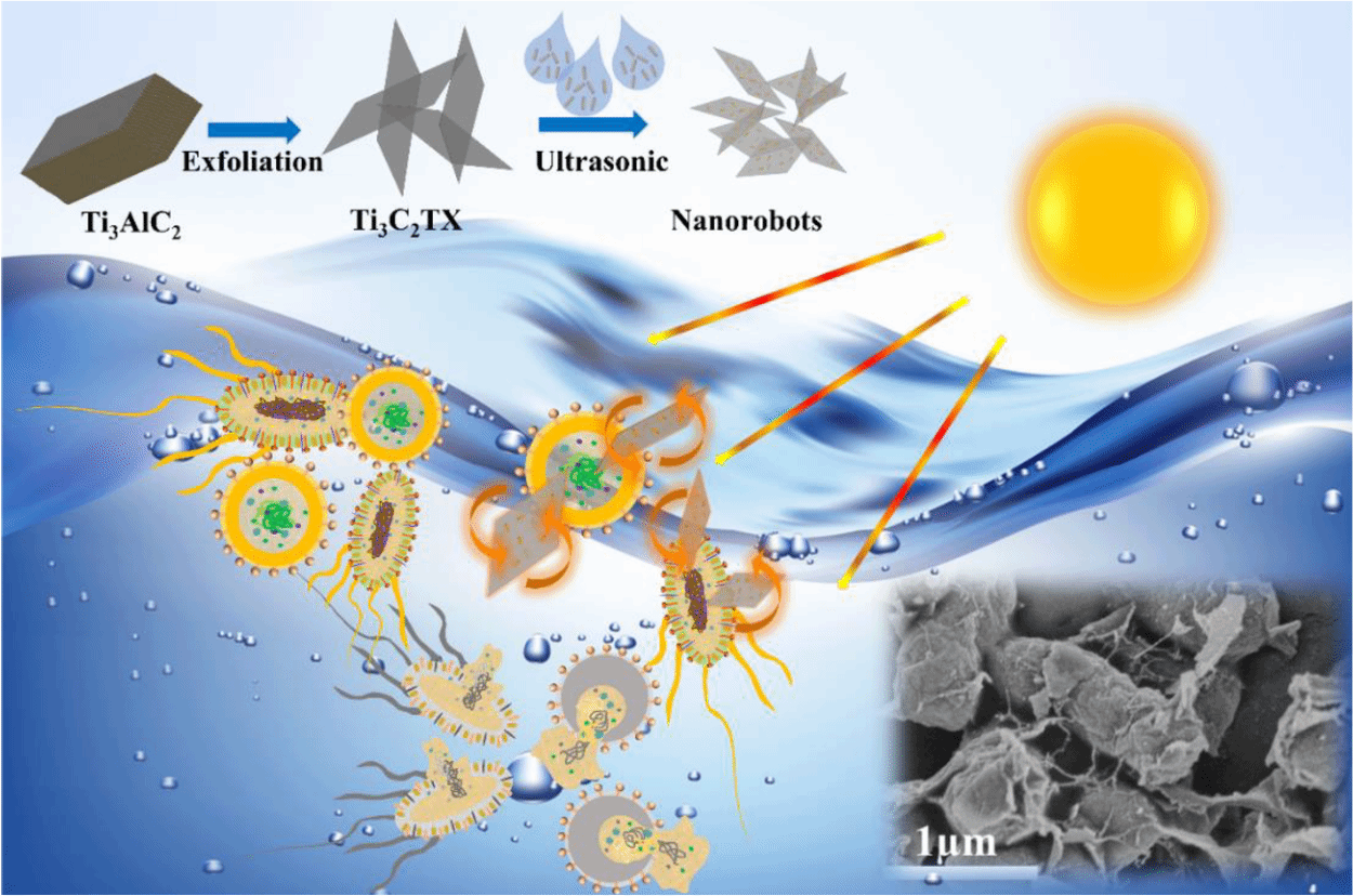 水体中的细菌污染对人类健康构成严重威胁,许多研究探索了利用二维纳米材料实现水体中的细菌灭活。然而,静态抗菌模式限制了其物理杀伤的有效性。为了解决上述问题,作者通过将超小金纳米棒(sAuNR)加载到MXene纳米片表面(MXene@sAuNR)制备了一种简单有效的抗菌纳米机器人。sAuNR的等离子体共振效应可以增强纳米机器人的光吸收截面,从而提高其对阳光辐照的吸收能力,并进一步转换为自身动能。这种具有动能增强特点的二维纳米机器人可以利用其锋利的二维边缘实现对细菌膜的切割,进而对细菌造成不可逆的机械损伤并导致细菌死亡。研究证明,具有良好光驱动特性的纳米机器人在5 μg/mL的超低浓度下即可实现接近100%的细菌灭活。此外,在自然光照射下,纳米机器人对于真实的河流样本依然表现出令人满意的抗菌效率。这项研究为新型自供能、多模式抗菌材料的设计提供了宝贵的思路。