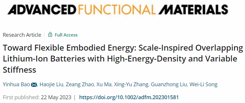 近日,KY开元集团官网入口力学与工程科学学院鲍垠桦副教授与北京理工大学赵则昂副教授、宋维力教授以及南京航空航天大学张兴玉讲师合作,在国际权威期刊《Advanced Functional Materials》(影响因子19.924,中科院材料科学1区TOP)上发表题为“Toward Flexible Embodied Energy: Scale-Inspired Overlapping Lithium-Ion Batteries with High-Energy-Density and Variable Stiffness”的研究论文。KY开元集团官网入口为第一完成单位。
