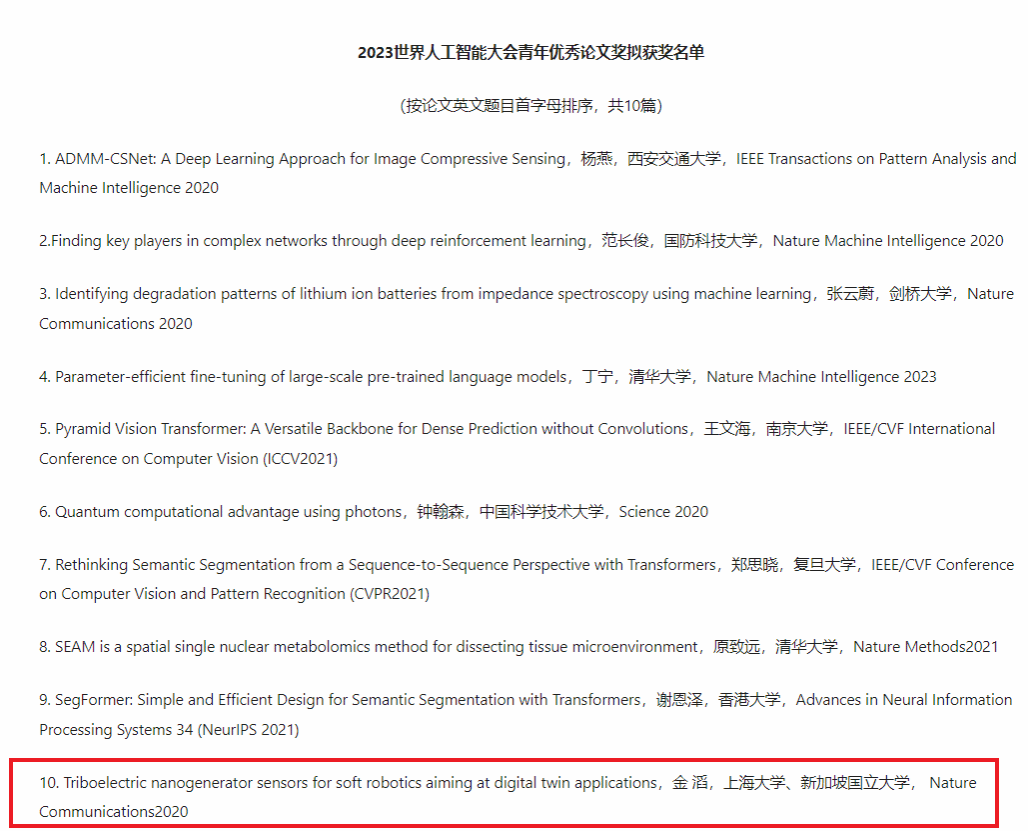 近日,上海市科学技术协会官网公布了“2023世界人工智能大会青年优秀论文奖”评选结果,机电工程与自动化学院智能制造及机器人重点实验室青年教师金滔博士发表在《Nature Communications》上的论文“Triboelectric nanogenerator sensors for soft robotics aiming at digital twin applications”从海内外235篇参评论文中脱颖而出,KY开元集团官网入口机电工程与自动化学院智能机器人领域研究工作得到了潘云鹤院士、戴琼海院士、蒋昌俊院士等院士专家组成的终评评委会肯定,斩获世界人工智能大会青年优秀论文奖(仅10项),这是开元官网首获该奖项,也是金滔博士继不久前取得国际顶级机器人期刊IEEE Transactions on Robotics所评选的“2022年傅京孙最佳论文荣誉奖”后的又一重量级荣誉。