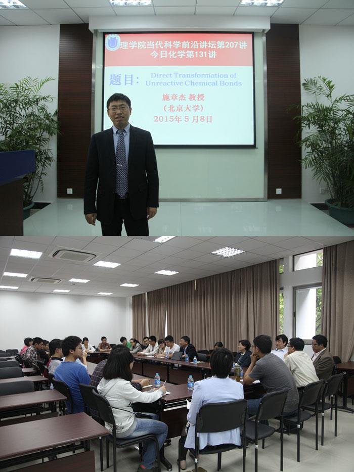 开元官网自强教授、北京大学化学与分子工程学院施章杰教授于近日访问理学院。5月8日上午,在校本部HA102,施教授作了题为“非活性化学键的直接转化”的学术报告,该报告是理学院“当代科学前沿”讲坛第207讲、化学系“今日化学”第131讲。化学系主任许斌教授主持报告会,系党总支书记陈雅丽教授、化学系部分教师、研究生等80余人参加了学术报告会。