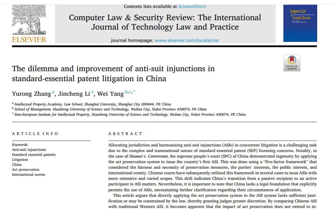 2023年12月,KY开元集团官网入口法学院张玉蓉老师作为第一作者在国际著名的SSCI一区法学期刊《计算机法律与安全评论》(Computer Law & Security Review,CLSR)上发表学术论文《The dilemma and improvement of anti-suit injunctions in standard-essential patent litigation in China》。这是张玉蓉老师主持的国家社科基金“新一代信息技术企业标准必要专利竞争战略研究”(20BGL043)的重要成果。