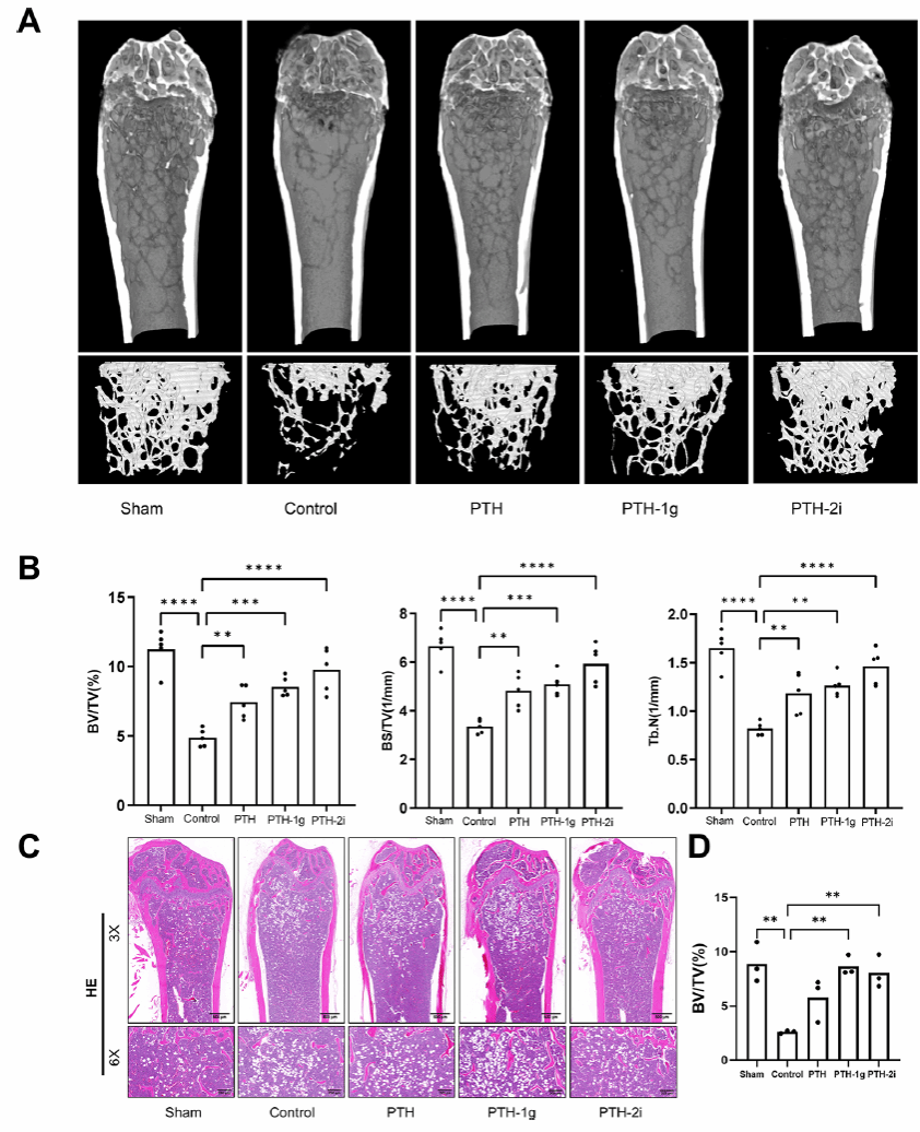 在获取的27个全新特立帕肽类似物中,通过体外实验ALP和茜素红S染色筛选出了PTH-1g和PTH-2i作为优化肽。结果显示,与原始PTH相比,这两种肽能更好地促进成骨细胞分化和矿化。进一步在卵巢切除(OVX)骨质疏松小鼠模型上的动物实验表明,PTH-1g和PTH-2i能有效、显著地缓解体内骨质疏松症的症状。此外,与PTH相比,PTH-1g和PTH-2i的血清稳定性更高。PTH-1g和PTH-2i可能成为治疗骨质疏松症的有效候选药物,所开发的SSG策略可作为一种糖基化方法来提升多肽药物的治疗效力。