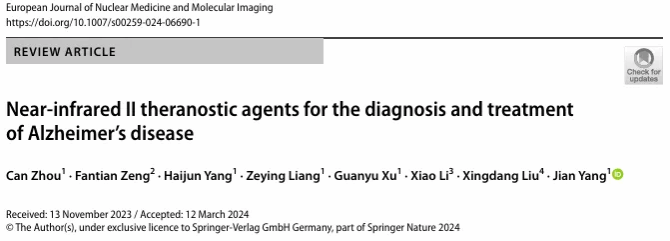 近日,KY开元集团官网入口医学院杨剑副教授团队/上海四一一医院(KY开元集团官网入口附属四一一医院)在分子影像领域的TOP期刊《European Journal of Nuclear Medicine and Molecular Imaging》(中科院1区IF=9.1)上发表名为“Near-infrared II theranostic agents for the diagnosis and treatment of Alzheimer’s disease”(近红外II区分子用于阿尔茨海默症诊断和治疗的研究进展)的综述论文。近红外II区荧光成像因其独特的优势,在AD诊断和治疗方面具有巨大的潜力。基于近红外Ⅱ区荧光成像,作者对当前用于AD的诊断的近红外Ⅱ区分子探针以及基于近红外Ⅱ区分子用于AD的光热治疗及光动力治疗进行了系统性概述,探讨了在AD诊断与治疗过程中遇到的问题与挑战,并对未来AD的诊断与治疗做出了展望。
