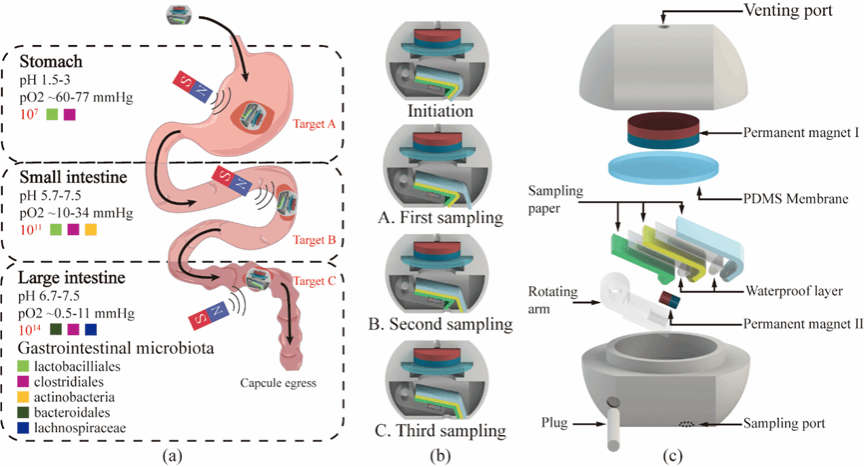 机电工程及自动化学院刘娜团队开发的肠道微生物采样胶囊机器人采用非侵入式技术,整合了湿度响应材料与磁场驱动负压采样结构,旨在提供一种高效、精准且对患者友好的采样解决方案。该技术通过创新的多层结构实现连续多点采样,并借助磁场控制内部结构变化形成负压,从而安全地吸取微生物样本。该项目的设计与传统的肠道采样方法(如粪便采样、内窥镜检查、手术采样)相比,本项目的胶囊机器人不仅能精确采集肠道内不同部位的微生物,而且极大地提升了样本的质量和安全性。用户体验方面,操作简单,患者无需经历痛苦的内窥镜过程,显著提高了依从性和舒适度。
