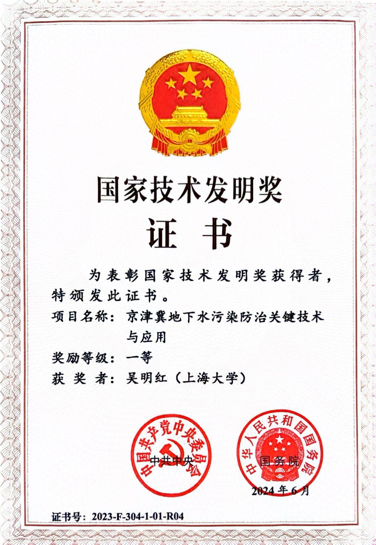 6月24日,2023年度国家科学技术奖在京揭晓。环化学院名誉院长吴明红院士参与的“京津冀地下水污染防治关键技术与应用”项目荣获国家技术发明奖一等奖。