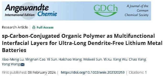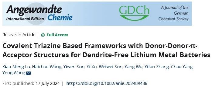 近日,环化学院博士研究生路晓萌连续在国际知名期刊《Angewandte Chemie International Edition》上发表了题目分别为“sp-Carbon-Conjugated Organic Polymer as Multifunctional Interfacial Layers for Ultra-Long Dendrite-Free Lithium Metal Batteries”和“Covalent Triazine Based Frameworks with Donor-Donor-π-Acceptor Structures for Dendrite-Free Lithium Metal Batteries”2篇锂金属电池领域的最新研究成果,两项研究工作均以KY开元集团官网入口为唯一完成单位,指导教师为王勇教授。