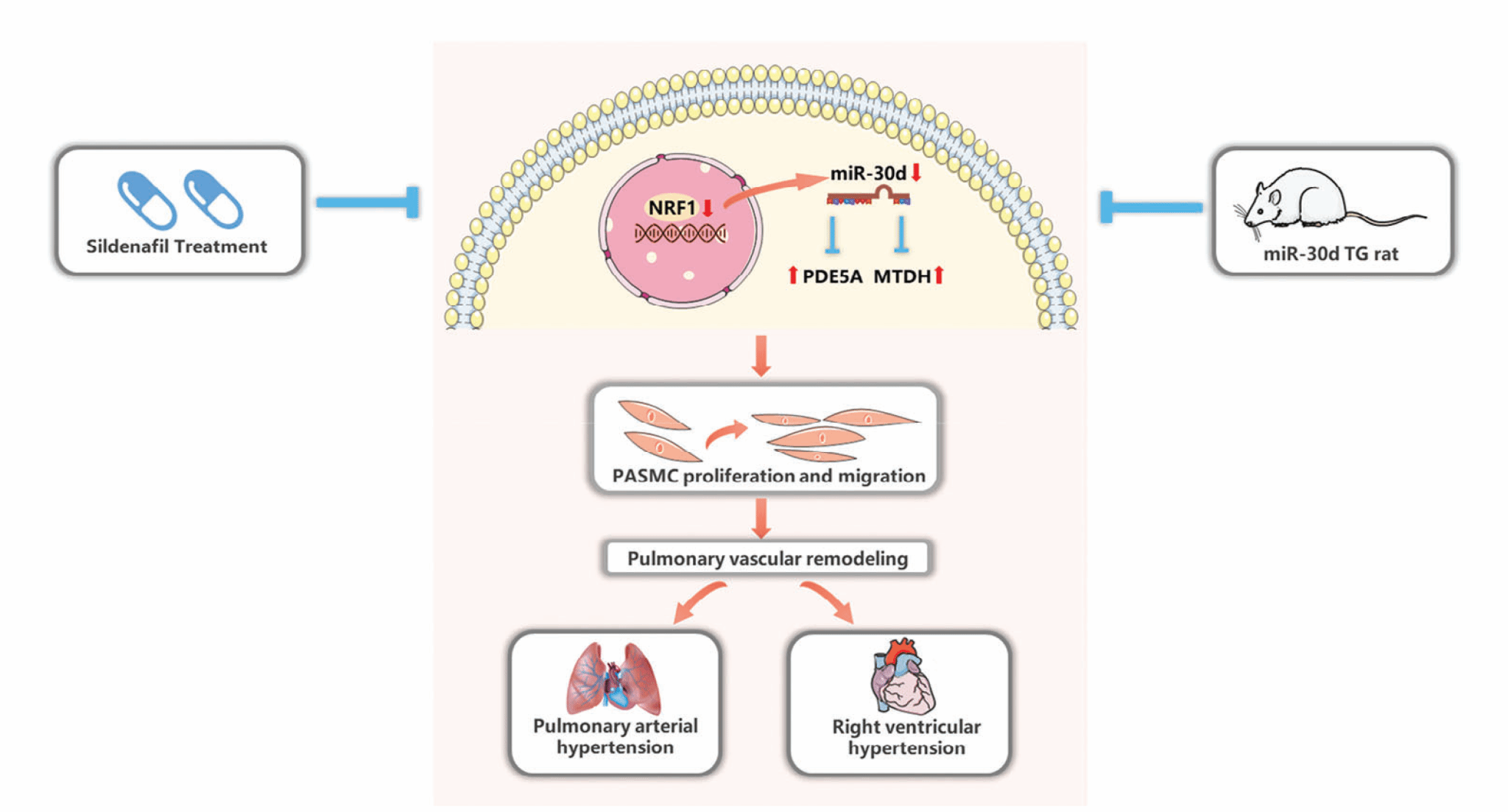 图:miR-30d下调介导肺动脉高压和肺血管重构,而过表达miR-30d是肺动脉高压的有效治疗途径,miR-30d介导西地那非在肺动脉高压中的治疗效应。