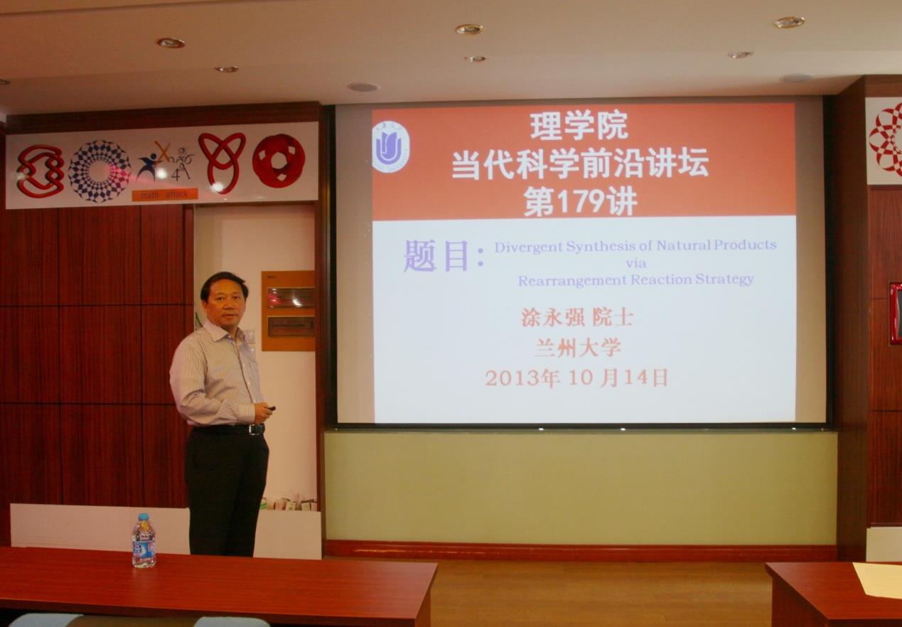 2013年10月14日,在校本部G507报告厅,中国科学院院士、兰州大学教授、KY开元集团官网入口自强教授涂永强先生应邀莅临理学院给师生们作了精彩的学术报告,题目“Divergent Synthesis of Natural Products via Rearrangement Reaction Strategy”,该学术报告为理学院“当代科学前沿讲坛第179讲”、今日化学系列报告第92讲、KY开元集团官网入口创新药物研究中心系列报告之二。报告由化学系系主任许斌教授主持,学工办主任林海霞教授、系党总支书及陈雅丽教授、曹卫国教授、贾学顺教授及化学系师生参加了报告会。